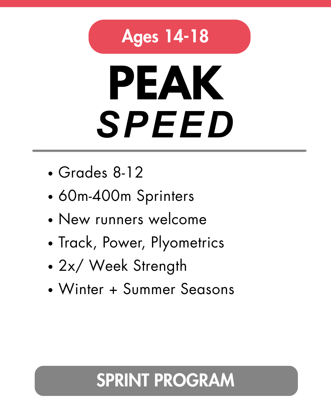 The 100, 200, and 400 have always deserved their own program. Peak Speed exists because sprint development requires a fundamentally different approach than distance training, and too many talented sprinters spend their off-seasons either doing nothing or running workouts that aren't building the qualities that make truly them faster. We train in the weight room and on the track with a coaching staff that takes sprint mechanics seriously. This program runs in the winter and summer, intentionally structured around your school track season so the work you do with us shows up when it counts.