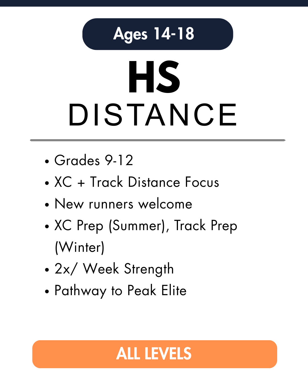 Whether your athlete is running varsity or lacing up for the first time, the High School Distance program meets them where they are and builds from there. We train in the summer with structured prep for cross country - the winter is focused on track prep, with strength training woven in twice a week in the off-season with one time per week options in their HS season.